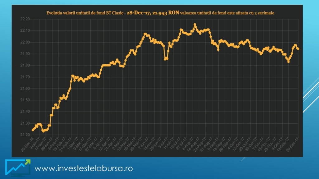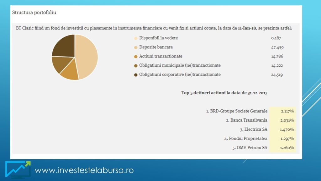 Îmi voi menține și în acest an expunerea pe fondul BT Clasic al celor de Banca Transilvania urmând să cumpăr periodic unități de fond. Am ales fondul BT Clasic deoarece sunt client Banca Transilvania și pentru că profilul de risc al fondului este unul mediu. Totodată posibilitatea lichidării în orice moment a unităților de fond cumpărate și păstrarea randamentului obținut îmi oferă o flexibilitate mai mare decât în cazul depozitelor bancare.