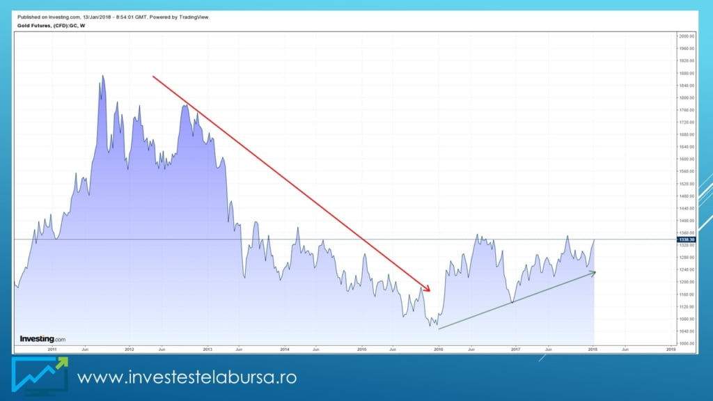 O altă investiție spre care merită să ne uităm în 2018 ar putea fi aurul. Într-un articol publicat pe blog în 2017 am arătat cum puteți investi inteligent în aur folosind certificate index listate la Bursa de Valori București. După o perioadă lungă de timp (2012 -2016) în care prețul aurului s-a aflat pe un trend descendent anul 2016 a adus inversarea acestui trend. O scurtă privire asupra graficului aurului pe o perioada mai lungă de timp ne face să constatăm ca odată cu anul 2016 perspectiva investitorilor asupra aurului a început să se schimbe.