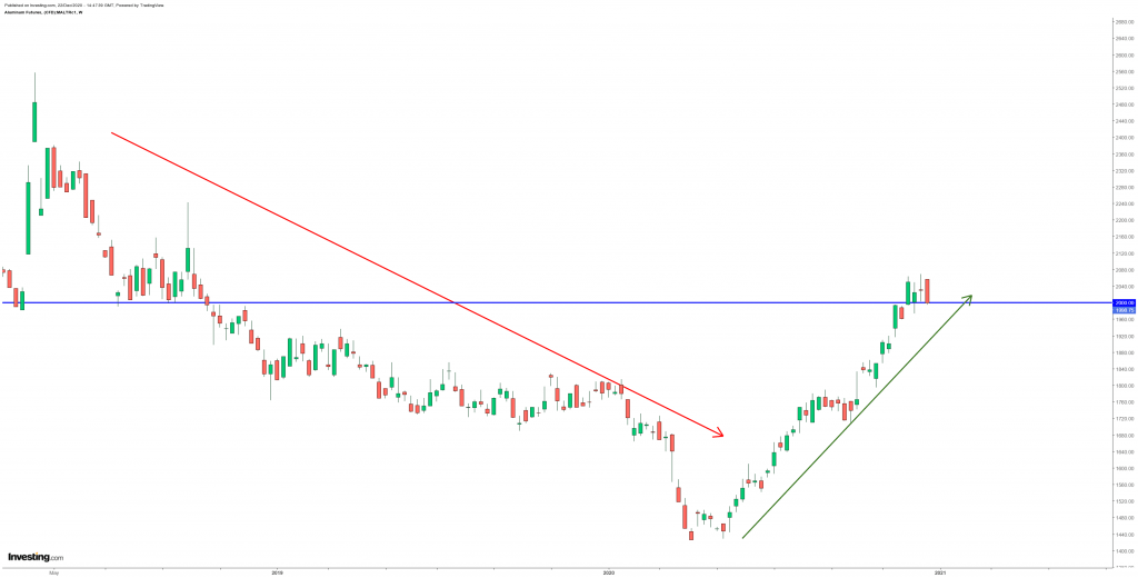 După cum se poate observa în graficul atașat, prețul aluminiului a atins un minim în primăvară, iar de atunci acesta s-a înscris pe un trend ascendent, aflându-se momentan într-o zonă de consolidare la 2000$.
