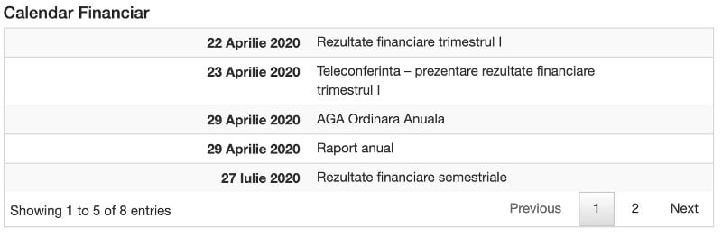 Reprezintă o serie de momente cheie pe parcursul anului în care compania va face o serie de comunicări referitoare la rezultatele financiare sau distribuția profitului.