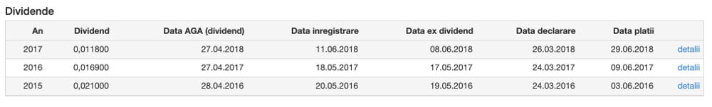 Secțiunea de emitent conține un tabel din care vei putea vedea care a fost valoarea dividendul distribuit în anii precedenți și dacă compania are obiceiul să distribuie în fiecare an dividende.
