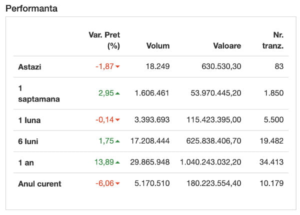 În secțiunea tranzacționare de pe pagina companiei vei găsi informații despre performanța bursieră a companiei (cât a crescut sau cât a scăzut procentual) în ultimele 30 zile sau în ultimul an dar și care a fost volumul de tranzacționare sau valoarea tranzacționată în acea perioadă.