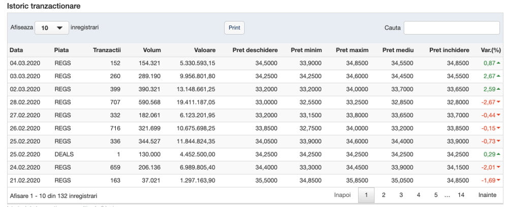 Tot în această secțiune poți vedea la nivelul fiecărei zi care a fost volumul de acțiuni sau valoarea tranzacționată pe bursă pentru acea companie. Urmărind media zilnică a tranzacțiilor realizate cu acțiunile acelei companii îți poți face o idee cam câte acțiuni poți cumpăra sau vinde într-o zi.