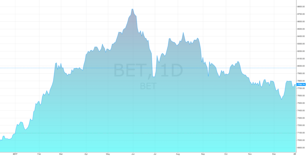 Indicele bursier principal al Bursei de Valor Bucureși,indicele BET, a avut până la jumătatea anului 2017 un avans de peste 24% fiind impulsionat de hotarârea guvernului de a obliga companiile de stat să distribuie cel puțin 90% din profit prin dividende. Jumătatea anului a adus însă multă incertitudine în piață iar acest lucru a condus la o depreciere a principalelor companii din componența indicelui. La finalul anului principalul indice bursieri mai arăta o creștere de 9 procente.