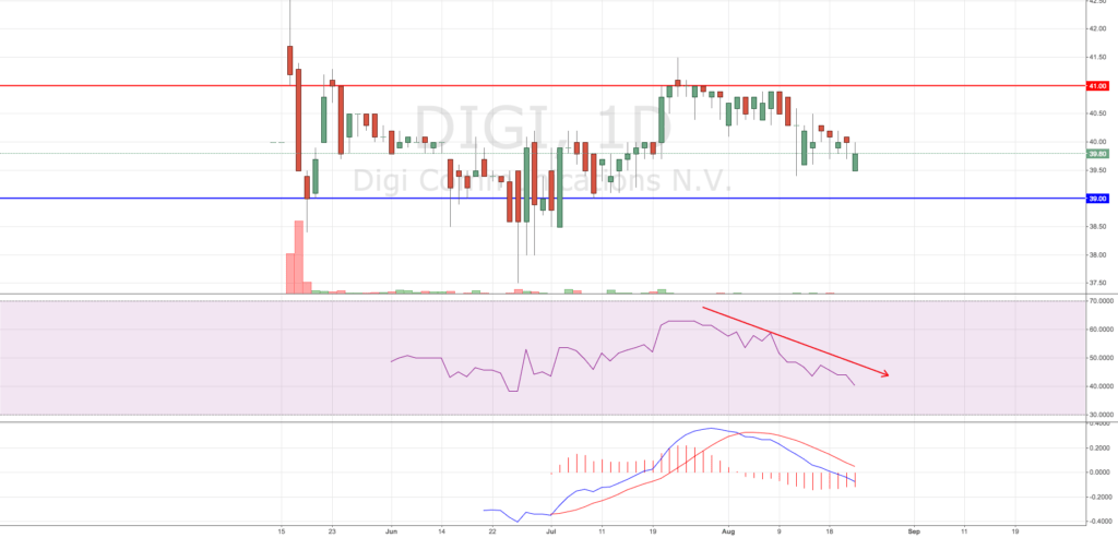 Chiar dacă Digi a raportat rezultate bune atât pe primul trimestru cât și la finalul lunii iunie acțiunile Digi nu au avut evoluția așteptată de mulți investitori. Prețul a stagnat mai mult, în intervalul 39,5 lei/acțiune și 41 lei/acțiune. Nici măcar știrea extinderea operațiunilor în Ungaria prin achiziționarea unei companii rivale nu a reușit să miște prea mult prețul. Chiar dacă histograma indicatorul MACD arată o slabă divergență pozitivă ce ar trebui să conducă la o apreciere pe viitor, cotația se indreaptă încet spre suportul de la 39 lei/acțiune atât indicatorul MACD cât și RSI arătând o posibilă depreciere a prețului.
