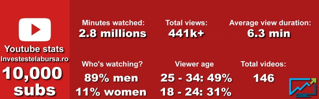 Luna Decembrie marchează un milestone important în cadrul proiectului Investestelabursa, depășirea pragului de 10,000 de abonați pe canalul de Youtube. Totodată, după mai bine de 3 ani de activitate și peste 140 de filmulețe publicate, datele analitice puse la dispoziție de Youtube relevă o serie de informații foarte interesante pe care le voi detalia în continuare.