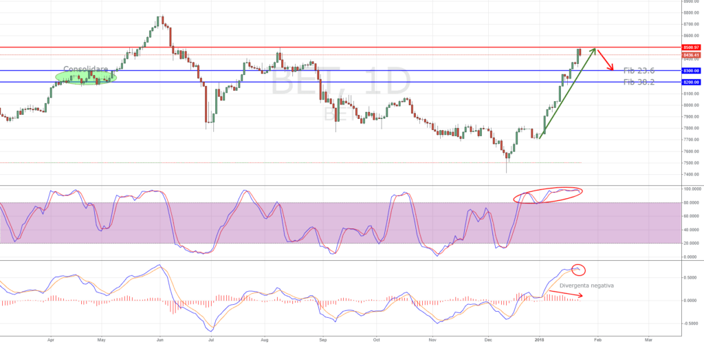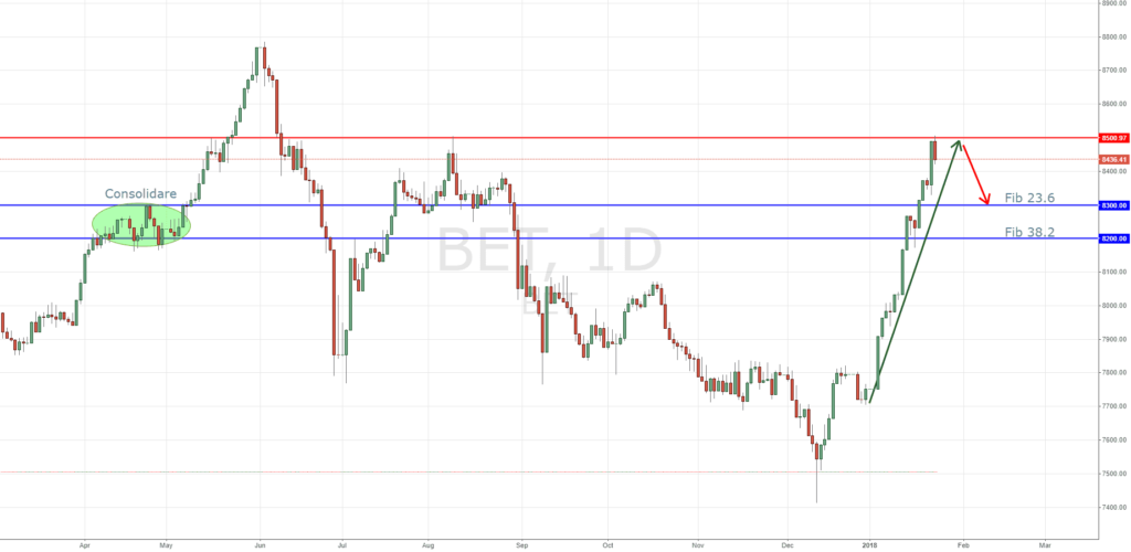 Primul nivel de suport care ar putea oferi o susținere cotației indicelui BET ar fi pragul de 8300 de puncte ce corespunde retragerii Fibonacci de 23,6 din avansul de anul acesta. În caz că acest nivel nu va reuși să susțină cotația indicelui am putea ajunge la pragul de 8200 de puncte nivel la care indicele s-a stabilizat și în perioada aprilie – mai 2017.