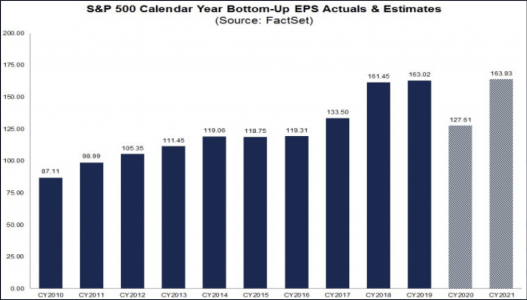 Dacă la finalul anului 2019 companiile din indicele S&P500 au raportat un EPS mediu la nivelul indicelui de 163 acum,  dupa evaluarea efectelor pandemiei analiștii estimeaza pentru finalul anului 2020 un caștig pe acțiune de 127.6.